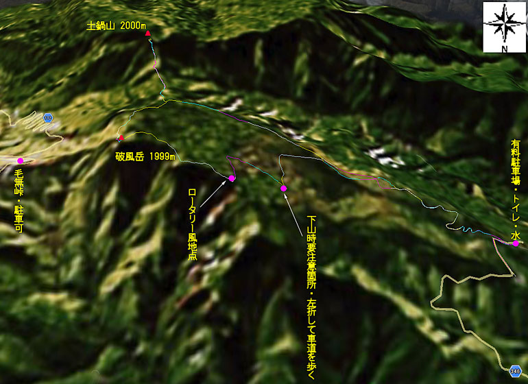 立ち枯れの木が多い | ピンク/破風岳へ 赤/毛無峠へ | |||