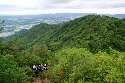 ロープが張られた急坂を慎重に下る | 快適な稜線(馬の背)歩き・前方には田園風景が | |||