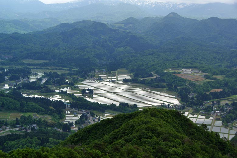 田園風景 前方に雪の守門岳・手前尾根筋は三角山 |