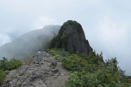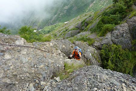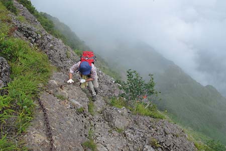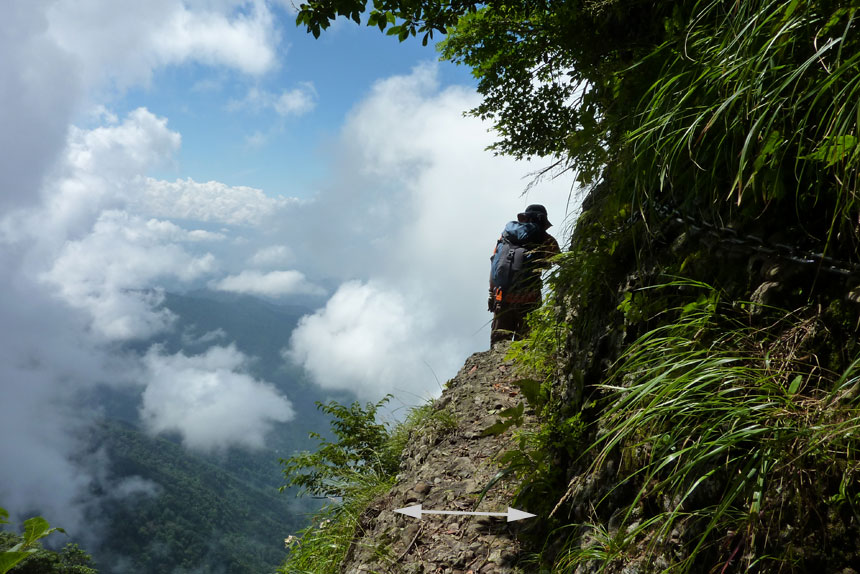 白河岳(標柱不鮮明) | ↓白河岳(標柱不鮮明)の鎖場No7を降りる管理人 | |||