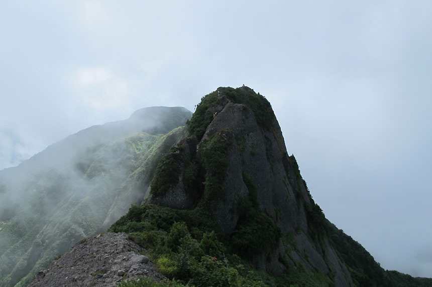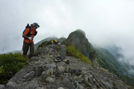 八ツ峰 ハイライト地点の摩利支岳を登る登山者達 / 釈迦岳(白川岳の標柱あり)から撮影 | ||||