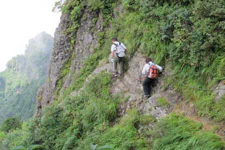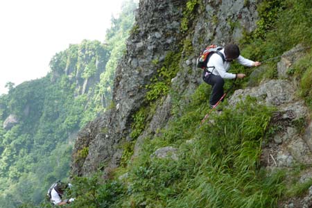 白河岳の東岩壁の横クサリ(No5)21b地点を通過中の管理人と家内 | ||||