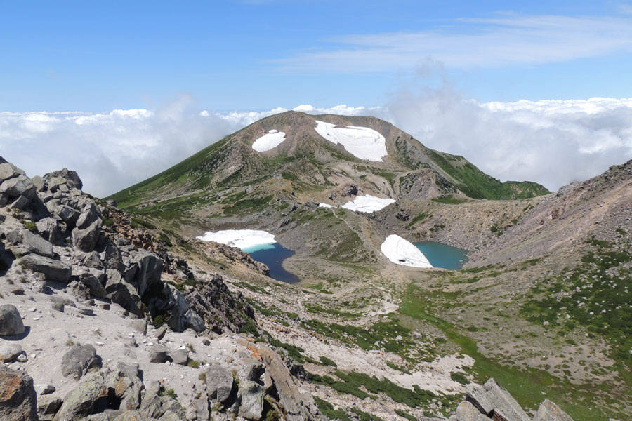 御前峰から望む大汝山と油ヶ池(左)・紺屋ヶ池(右) |