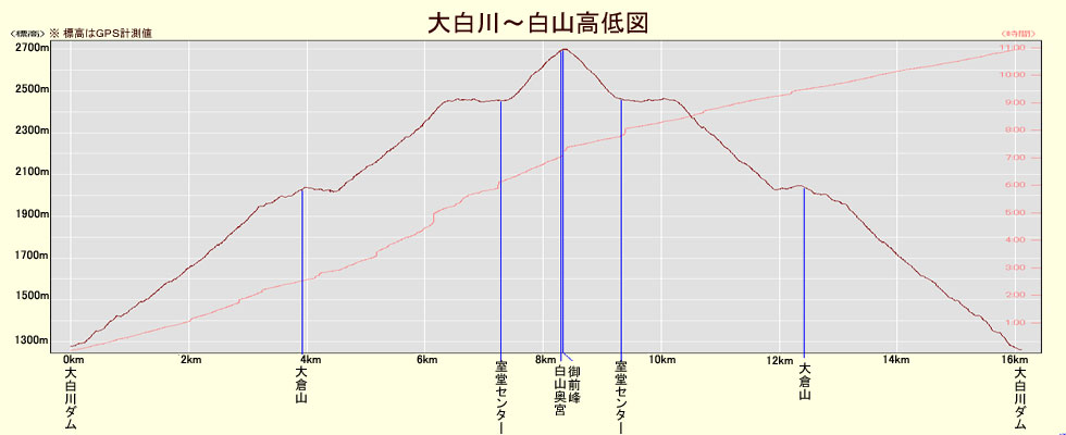 大白川駐車場標高/1230M 標高差/1472.2M 総歩行距離/16101M |