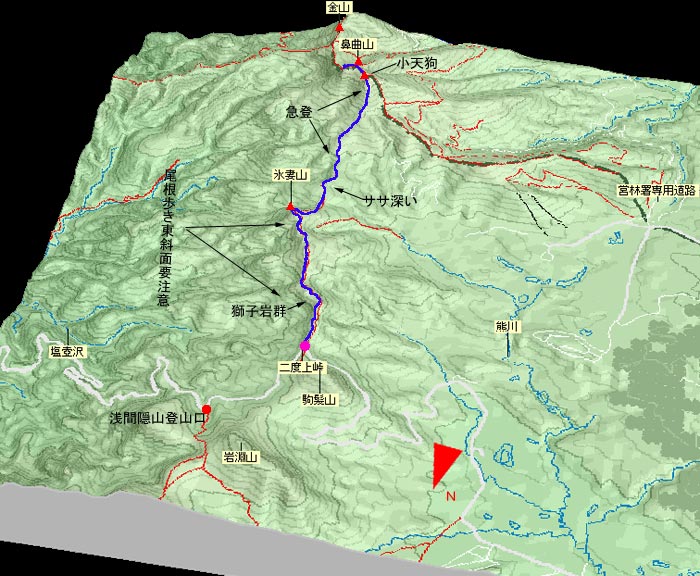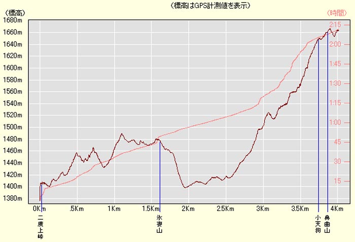 鼻曲山高低図![]() 氷妻山を下ってから鼻曲山への急登が読み取れる |