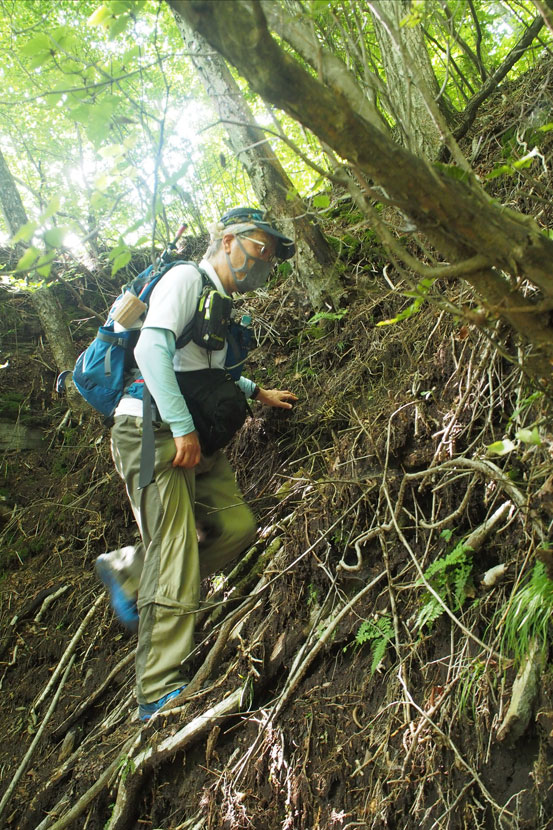 氷妻山への登り返し 急登につきマスクをはずすが10b間隔を保つ |