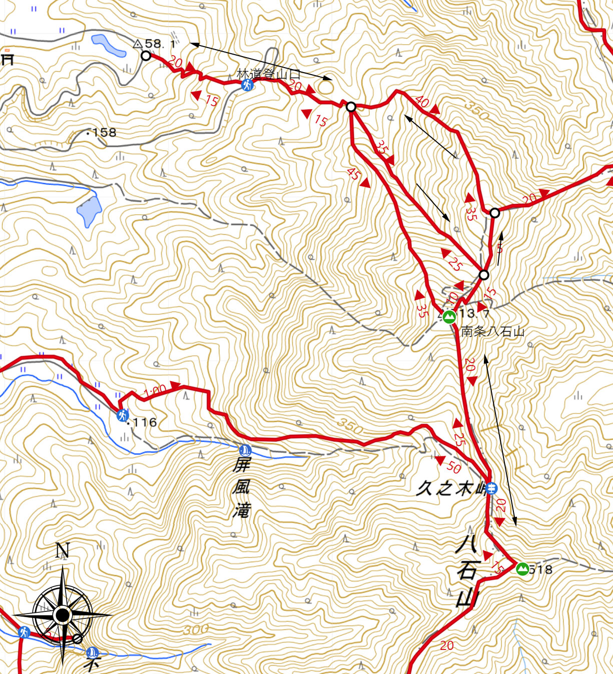 八石山ルート地図・YAMAPより転載 (計曲線 50M 主曲線 10M) |
