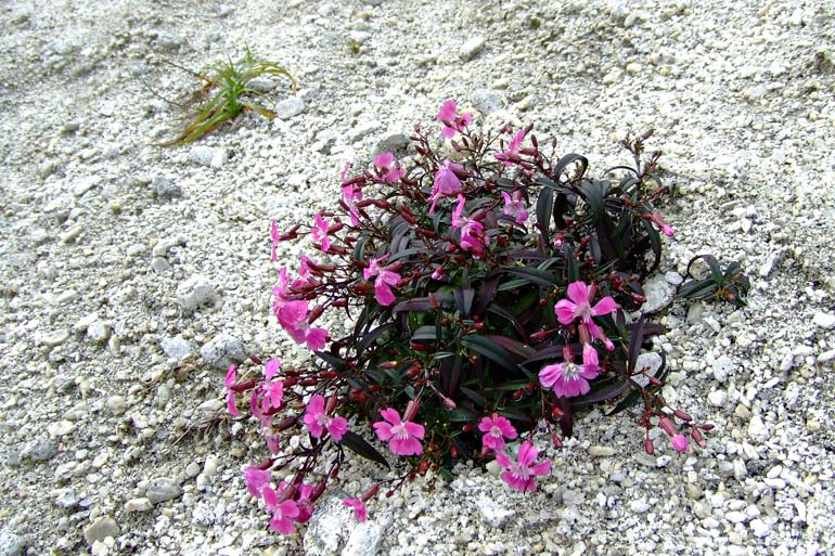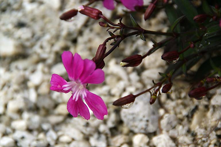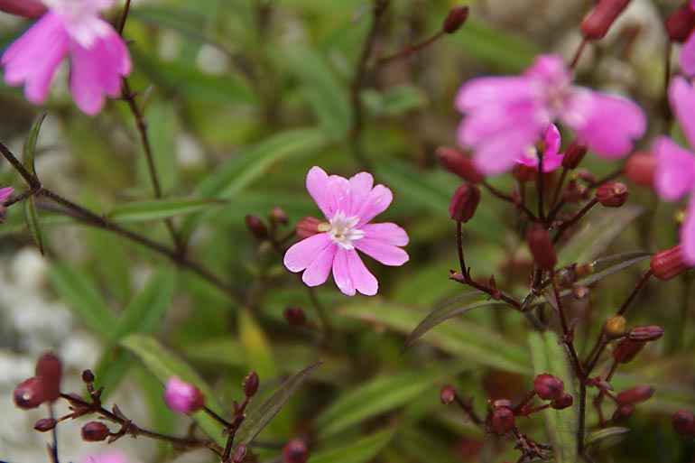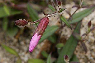 日向山の山頂では明らかにオオビランジと思われる花が沢山咲いていました。 ★ビランジ 「萼に腺毛を密生するものをいう」 分岐上部砂礫地帯に3−5株ありました。 ★タカネビランジ 「高さ10−20cm 茎に下向きの曲がった毛があり、上の方では繊毛が混じる」 山頂近辺の砂礫地帯に3株ありましたが確証はもてませんでした。 |