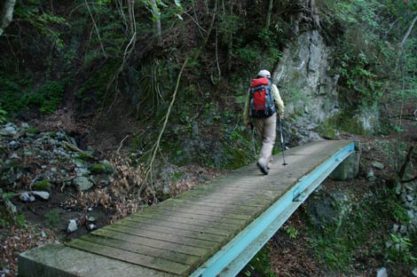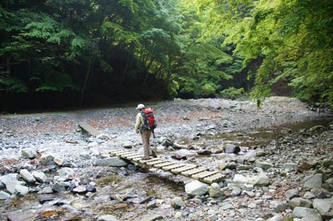 砂防堰堤手前の鉄橋を渡る | この木橋、大雨でも大丈夫なの・・・ | |||