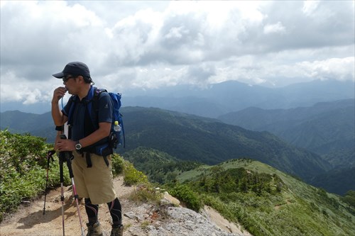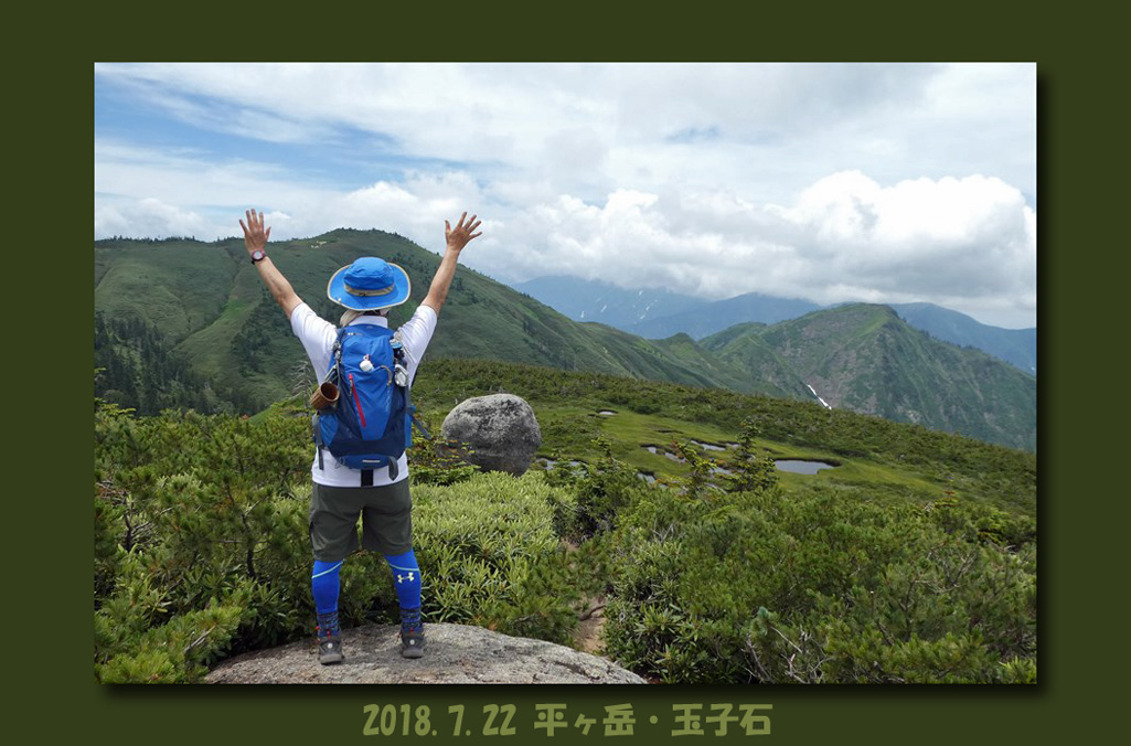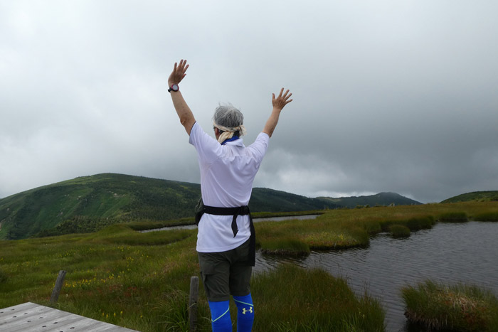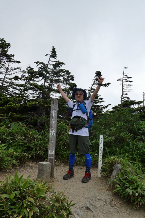 池ノ岳・姫ノ池より管理人いつものポーズ (^O^)v 愛用の青色長袖冷感シャツは登山口から10分ほどで蒸し暑さに負けてしまいました(笑) |