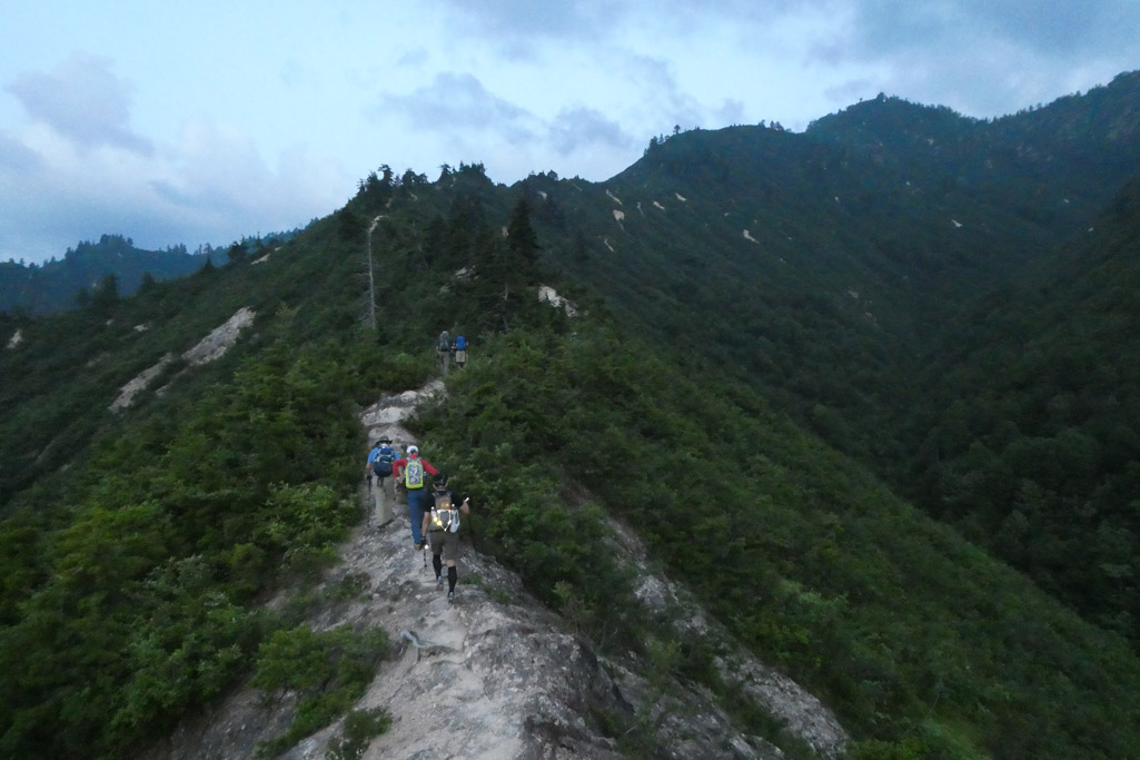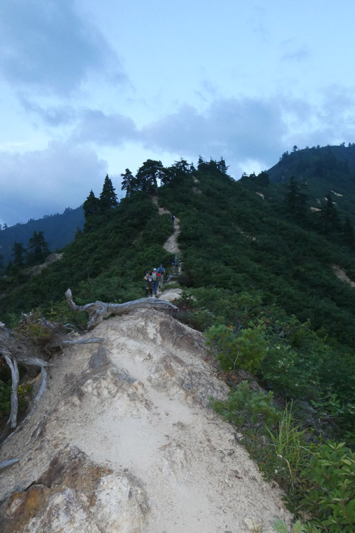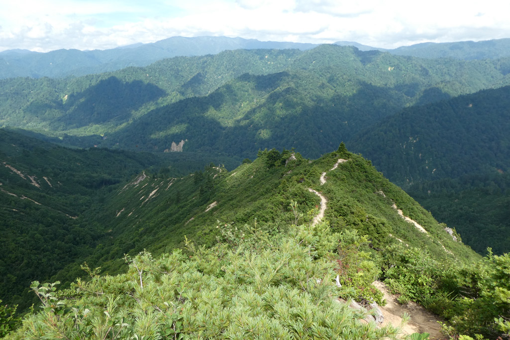 痩せ尾根は道幅が広いので安心だが、左右が切れ落ちているので慎重に歩を進めたい | ||||