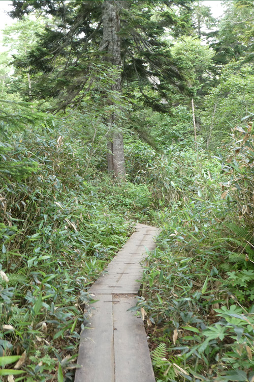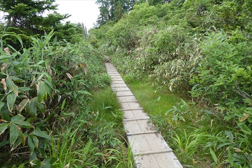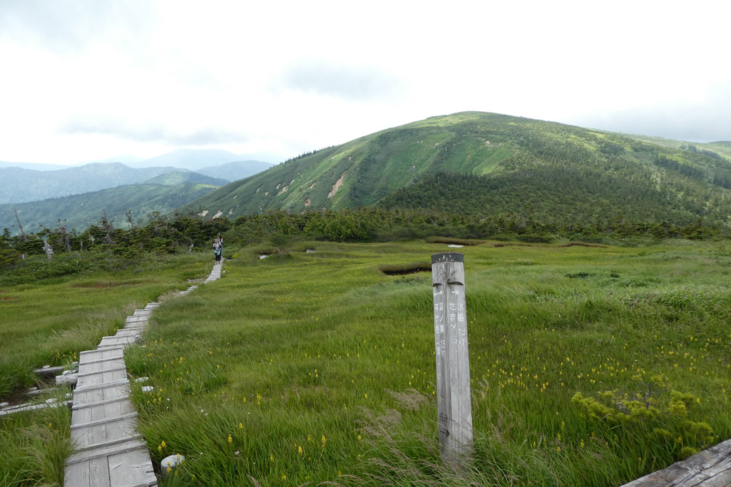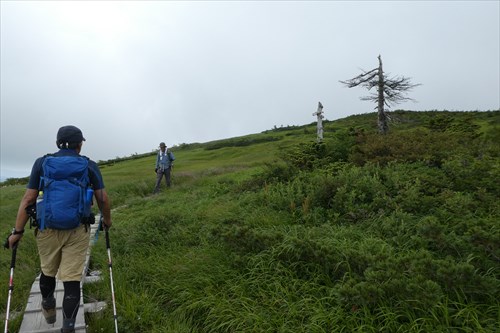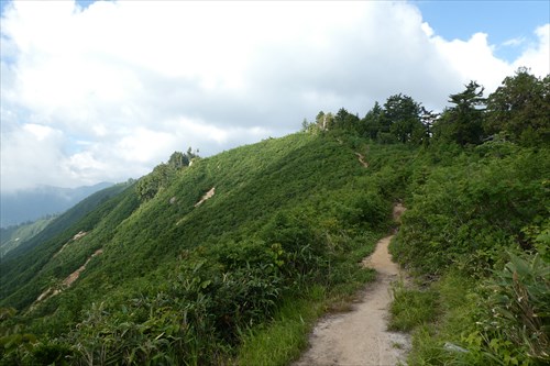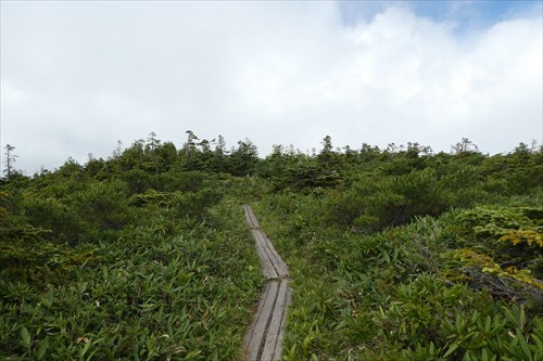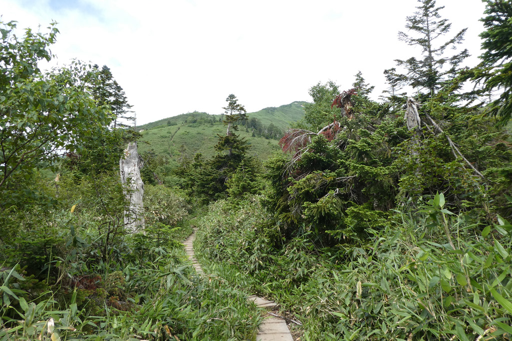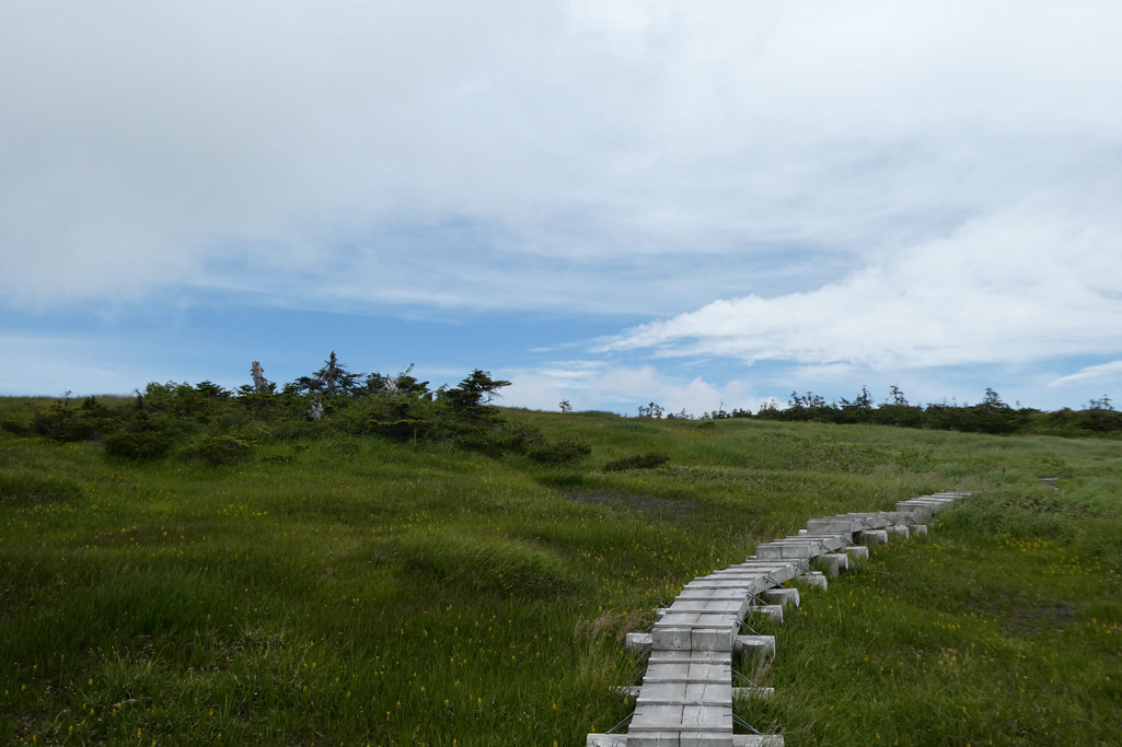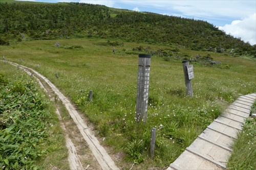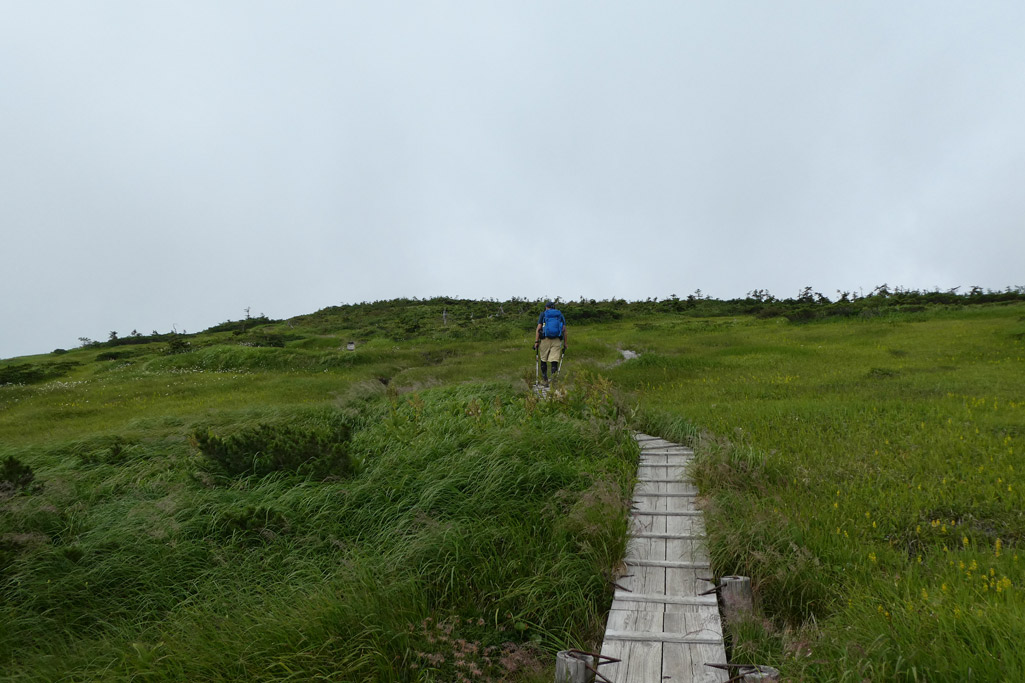 痩せ尾根終了後は太陽モロ浴びの稜線歩きとなる | 木道あり | |||