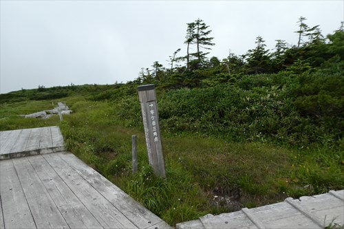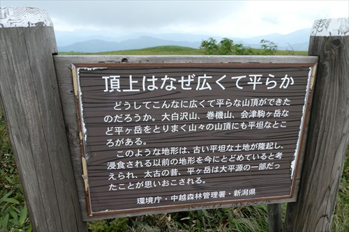 平ヶ岳最高点(2141m)10:51 山頂標はなく、解説板&この先通行止めの指導標が立つ |