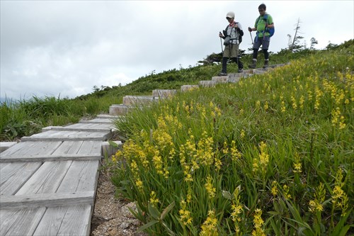 玉子池からUターンの登山者&キンコウカ群生 | |||