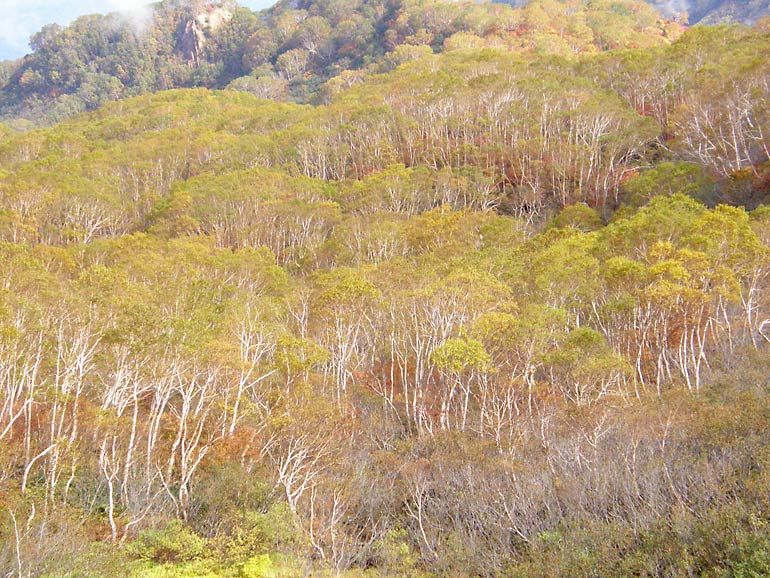 ここからダケカンバの尾根道に取り付くと右前方に「鬼ヶ城」と呼ばれる断崖がそびえ立つ。