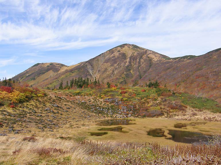 逆さ火打が写る「天狗ノ庭湿原」に出る。