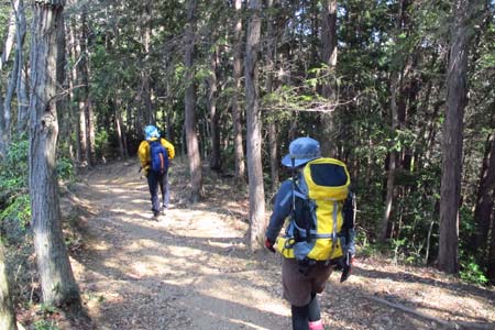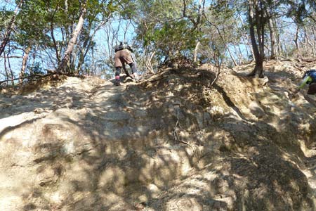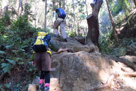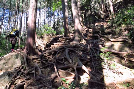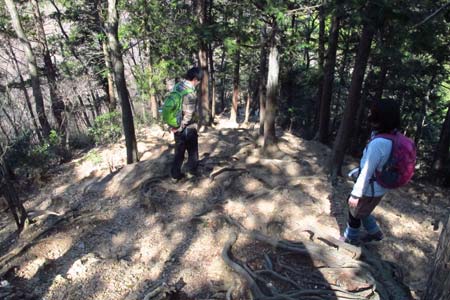 日和田山西斜面の急坂を下る |