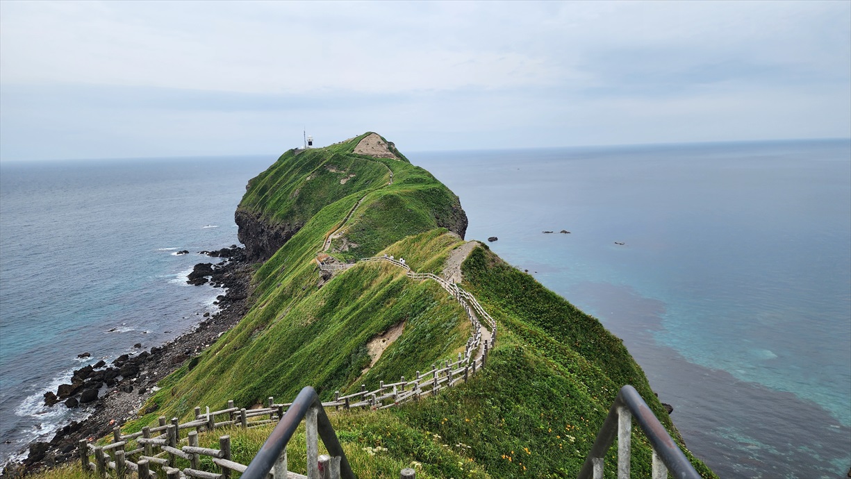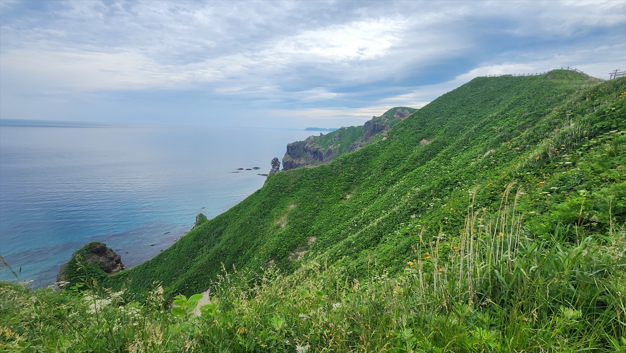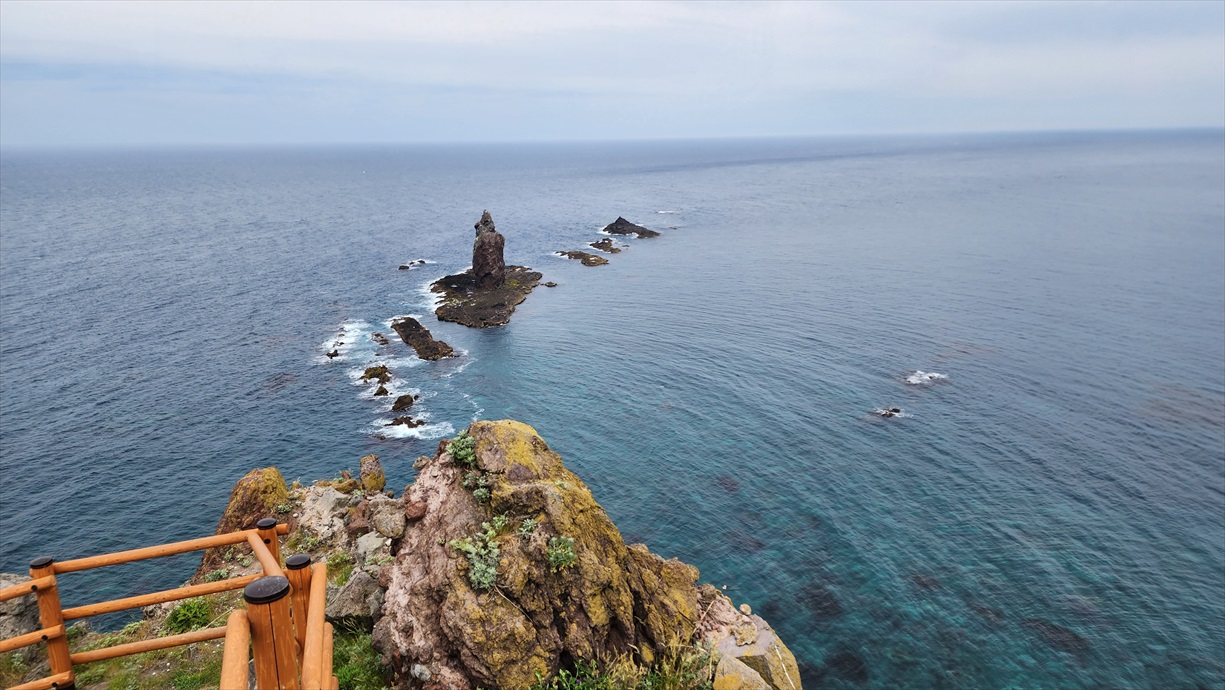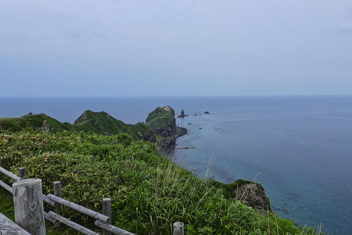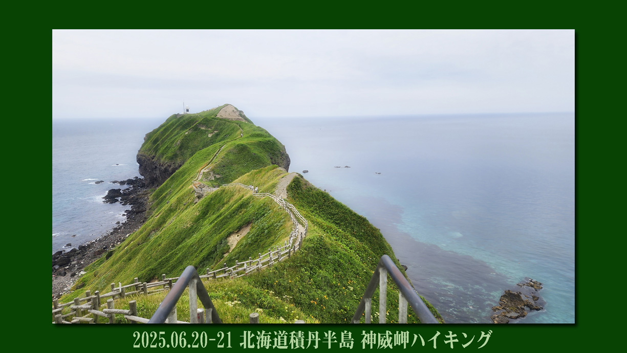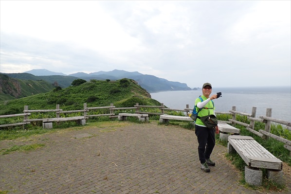念仏トンネル上の展望台から神威岬全景 駐車場に戻るなり雨降りに・・・(^O^)v |