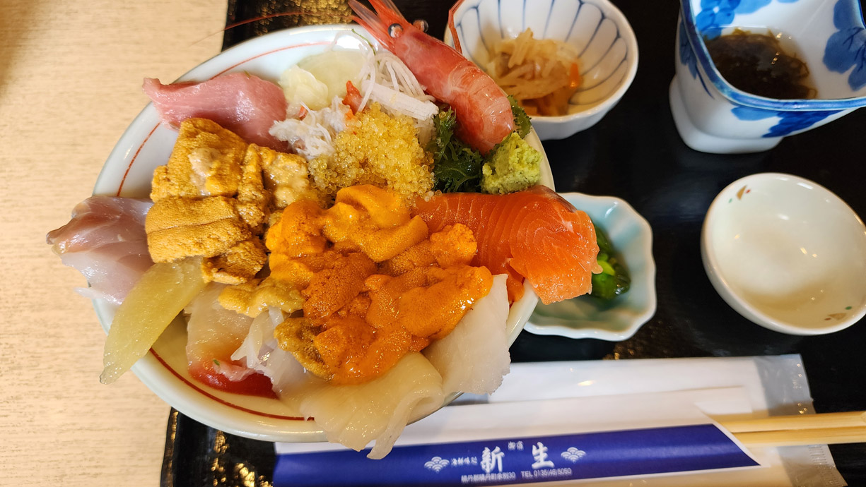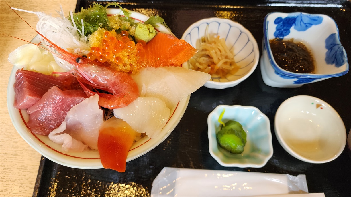 積丹半島 海鮮処「新生」でランチタイム ペット同伴可をうたっているのを承知で入店したが「鳥・犬・猫の毛アレルギー」を持っている爺には辛いお店だった (ノД`) |