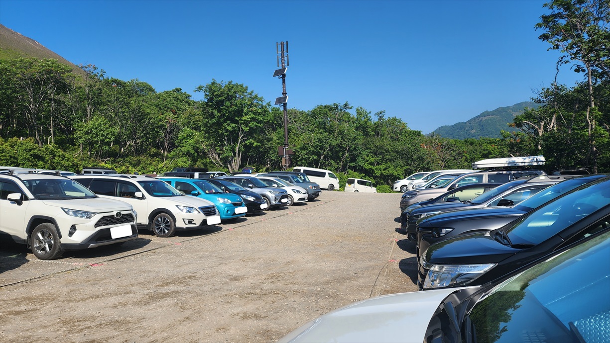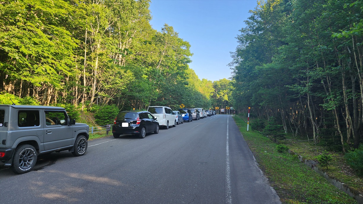 樽前山五合目ゲート 七合目駐車場6時到着予定で移動したのに登山口Pが満車のため5合目ゲートでこの車列 (;´Д`) |