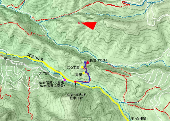 ![]() クリックすると「仏岩・登山口」近辺の 広域地図を見ることが出来ます。 マップコード 468238233 |