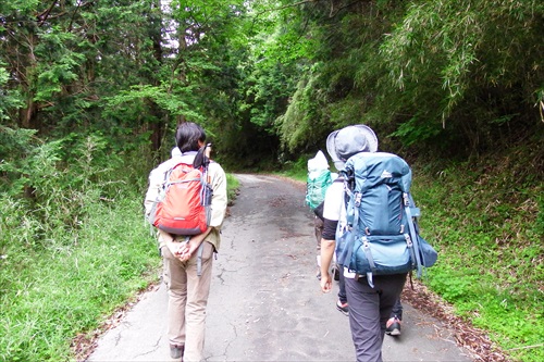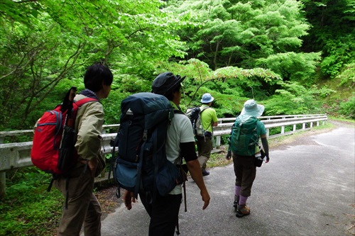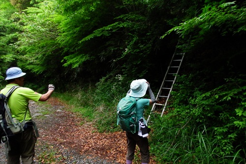 しばし車道を歩いて | このアルミ梯子が本日の登山口 | |||