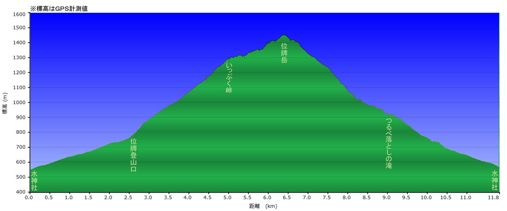 水神社駐車場標高/526m 標高差/931.5m 累積標高/1043.7m 総歩行距離/11817m | ||||
