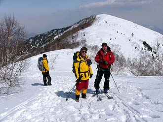 瑪瑙山からの山スキ−ヤーと記念撮影 (仮ピーク付近で撮影) |
