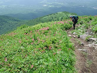 花の時期に登ったのは初めてでしたが、普段は胸突き八丁の場所(天狗の硯石〜南峰)に、シモツケソウ クガイソウ・ハクサンフウロ・ヨツバシオガマなどが咲き乱れていて急登も気にならず登れました。 |