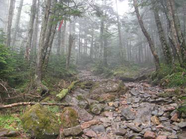 (岩ゴロの急峻地には約40b間隔でケルンが設置されており濃霧でもロストの確率は低い)