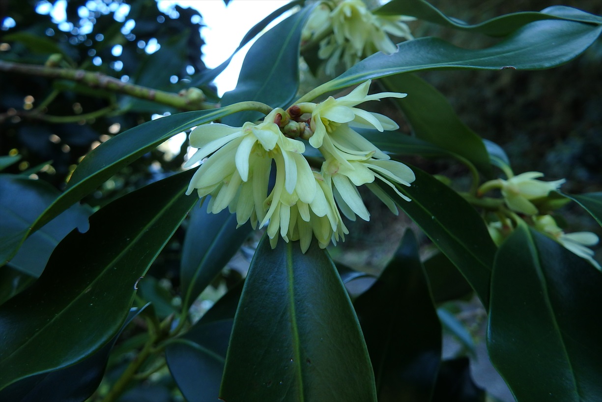 シキミ ミカン畑の跡地に何本も植えてあり果実は中華料理で多用される八角に似ているが猛毒植物なので誤食に注意! 仏事・神事に用いられ抹香や線香として利用される植物です |