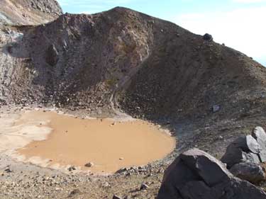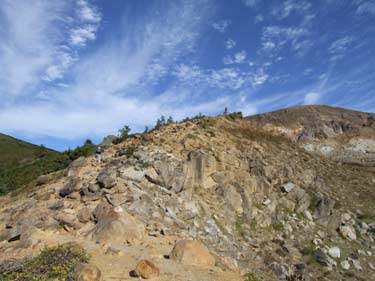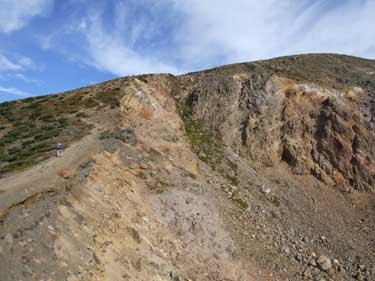 中腹火口縁のガレ場を登る | 中腹の噴火口 | |||