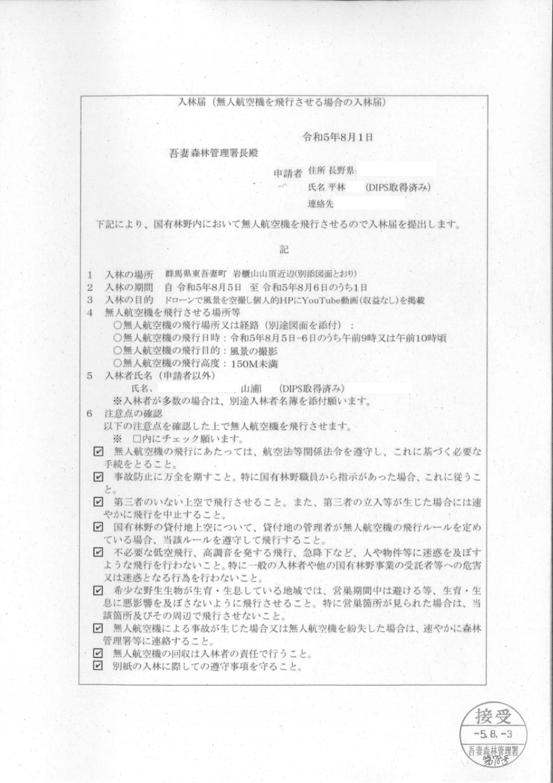 ドローン飛行空域が国有林なので遅くとも五日営業日前に入林届けを提出 | ||||