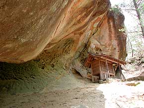 10.屋根状に張り出した巨岩の下に「三社 権現」があり神々しい不思議な場所です。 地元の人はここを岩殿山と呼ぶ。 |