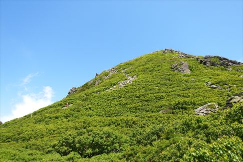 岩木山 1624.7M (注)山頂は岩だらけでミチノクコザクラの植生はありません |