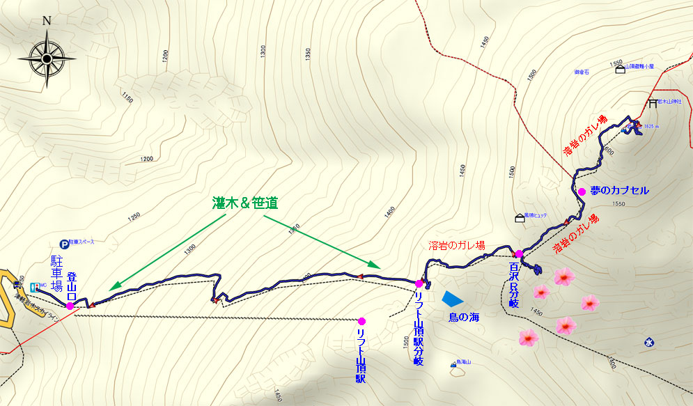 とりのうみ噴火口跡(リフト山頂駅分岐点) 山頂まで25分指導標あり | ||||