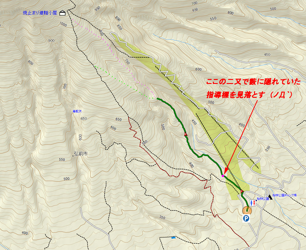 登山口駐車場発 7:18 〜 スキー場登山口 7:22 〜 砂防堰堤 7:32 〜 途中でルートミスに気づくが尾根上部で合流できそうだったので登り込むも藪避けで体力消耗し撤退を決意 8:21 ★予定になかった岩木山八合目からの登山に変更 (;´Д`) |