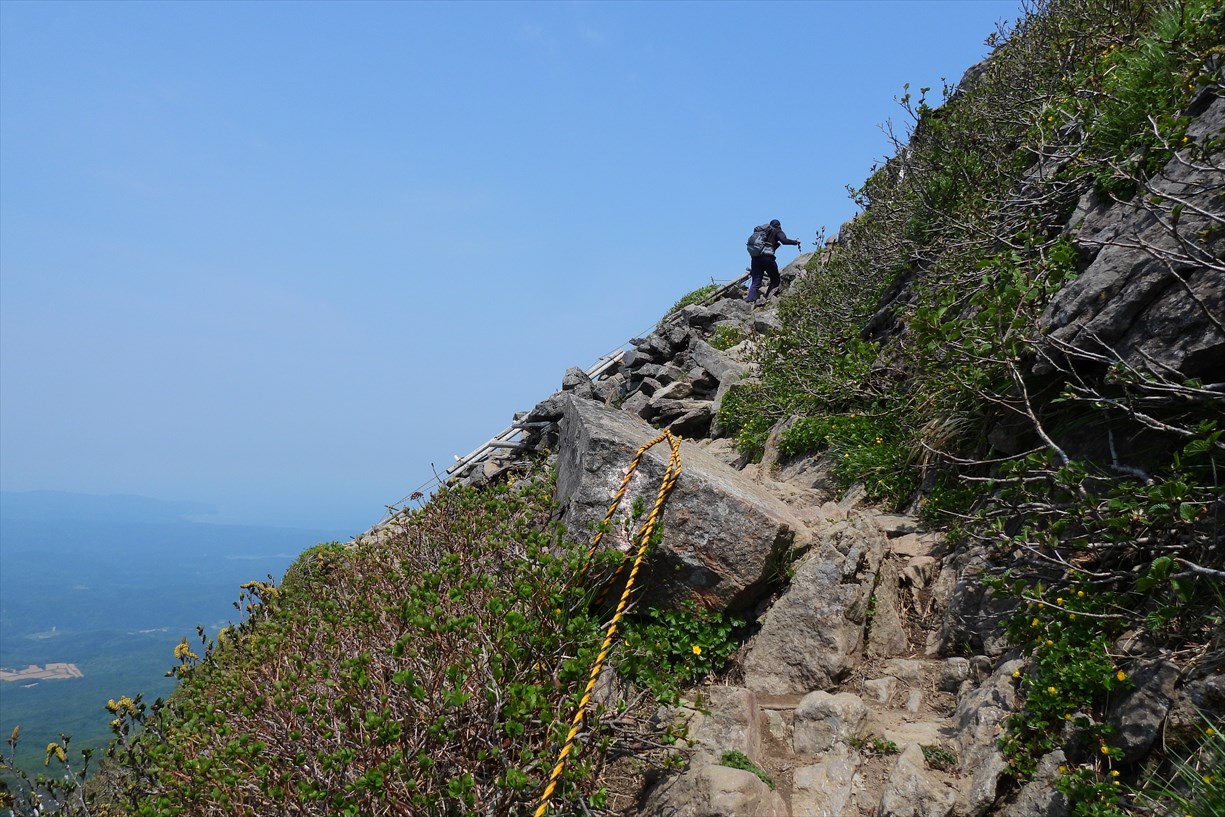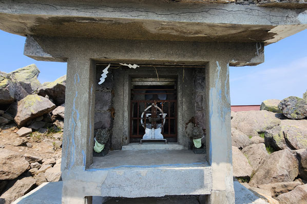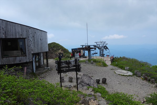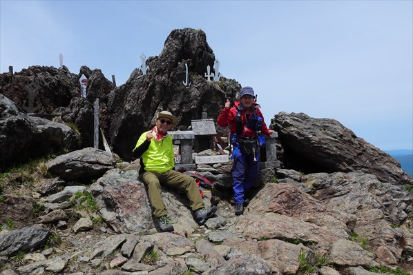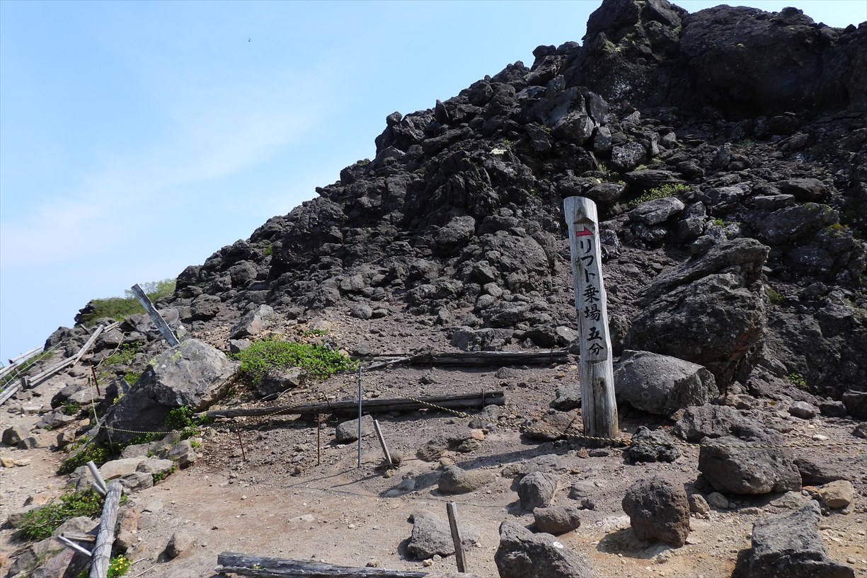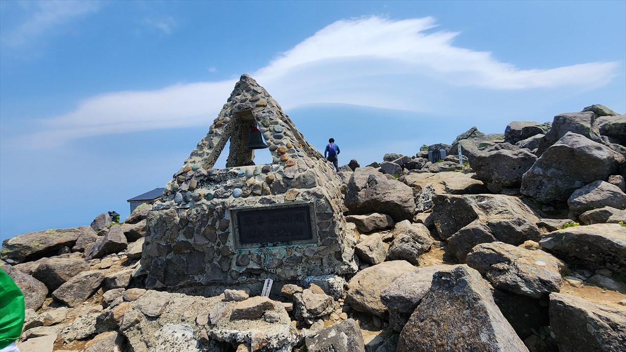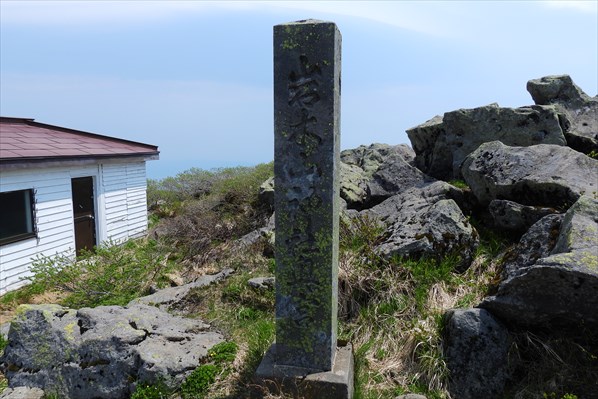岩木山山頂 1624.7M ザック込みで70㌔超の爺でも吹き飛ばされそうな強風のためささっと退散です |