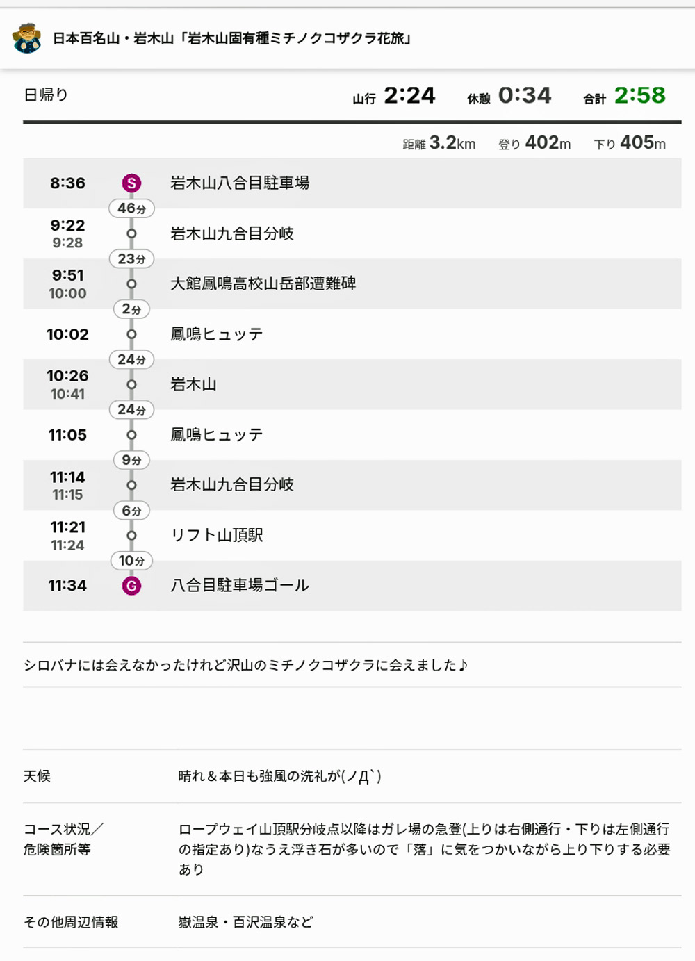 《岩木山ミチノクコザクラ花旅コースタイム他》 写真撮影時間20分~100分含む |