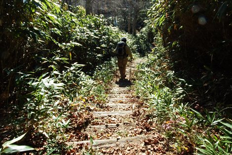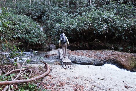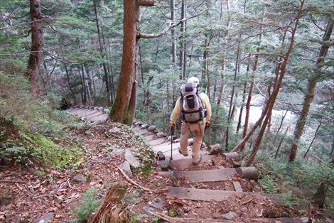 木段が風化したせいか昔と比べて歩きやすい | 沢に近い木段は手入れがされているようだ | |||