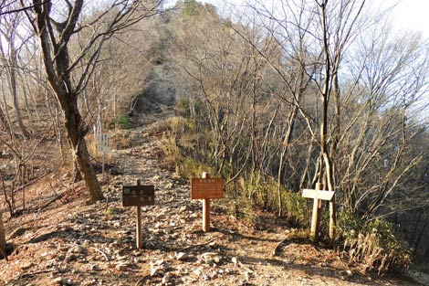 男坂・女坂分岐点(下) 男坂は落石事故防止のために閉鎖されているので登る場合は自己責任で |