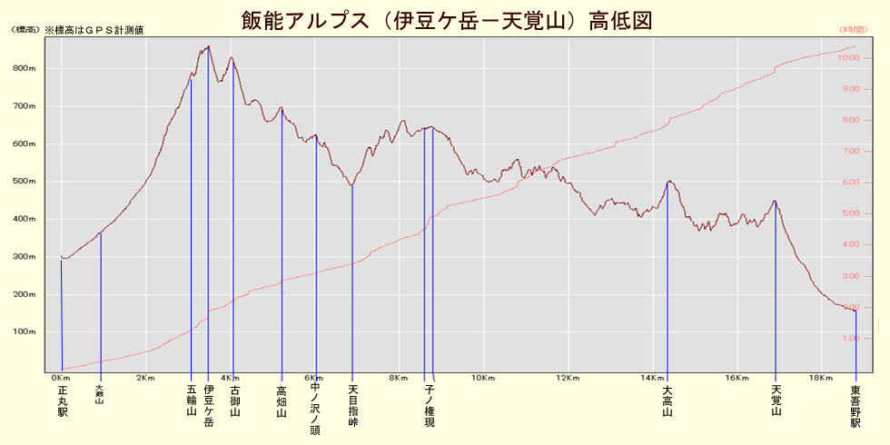 正丸駅P標高/300M 東吾野駅標高/130M 標高差/720.9M 総歩行距離/18804M | ||||