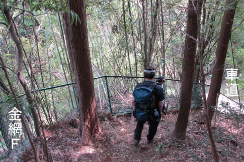 車道は左側歩道を歩き、谷筋に設置された 指導標を見逃さないよう注意 |