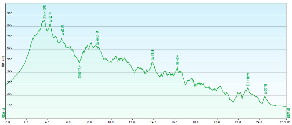 正丸駅標高/300M 飯能駅標高/106M 標高差/744.9M 総歩行距離/26505M | ||||