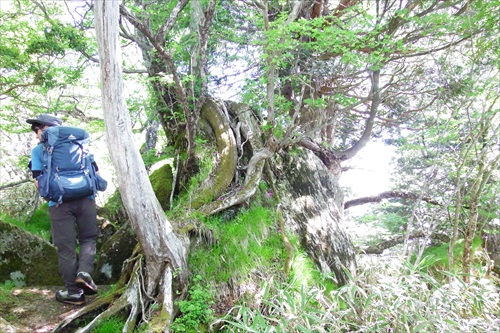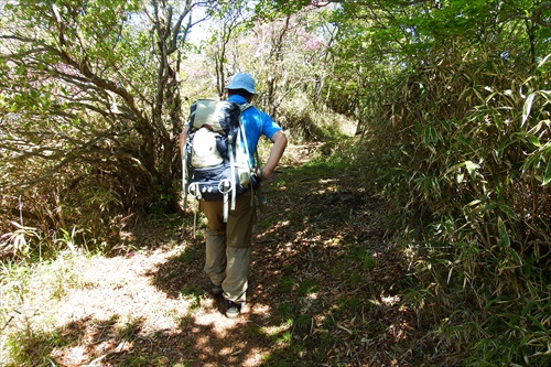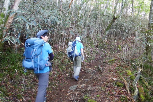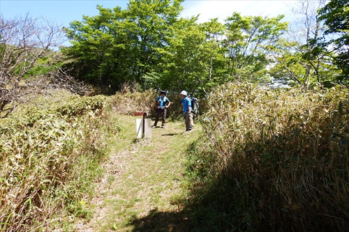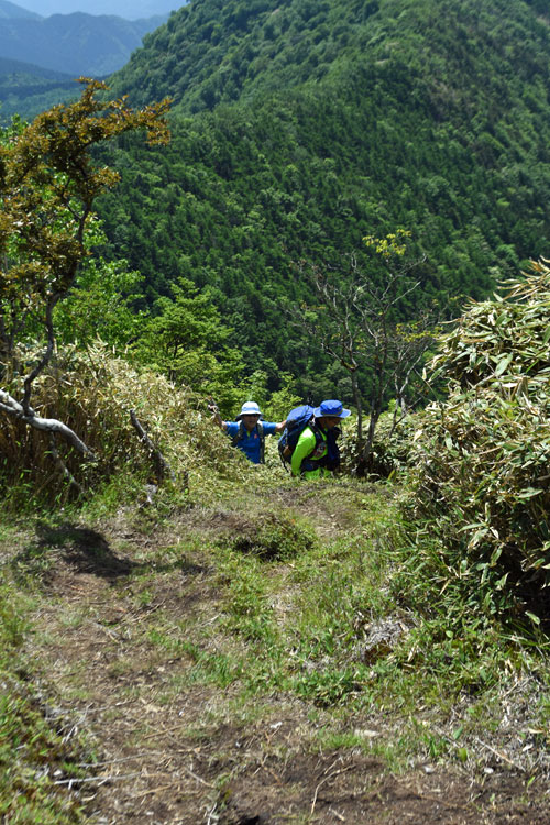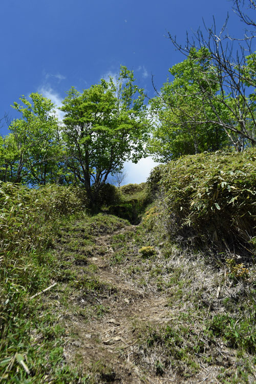岩岳手前展望地は笹原の踏み跡を30bほど緩く下る |