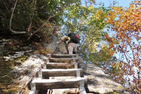 ほぼ垂直の梯子 | 黒戸山の巻き道で休憩 | |||