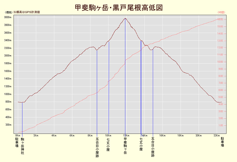 駐車場標高/770M 標高差/2197M 総歩行距離/22581M | ||||