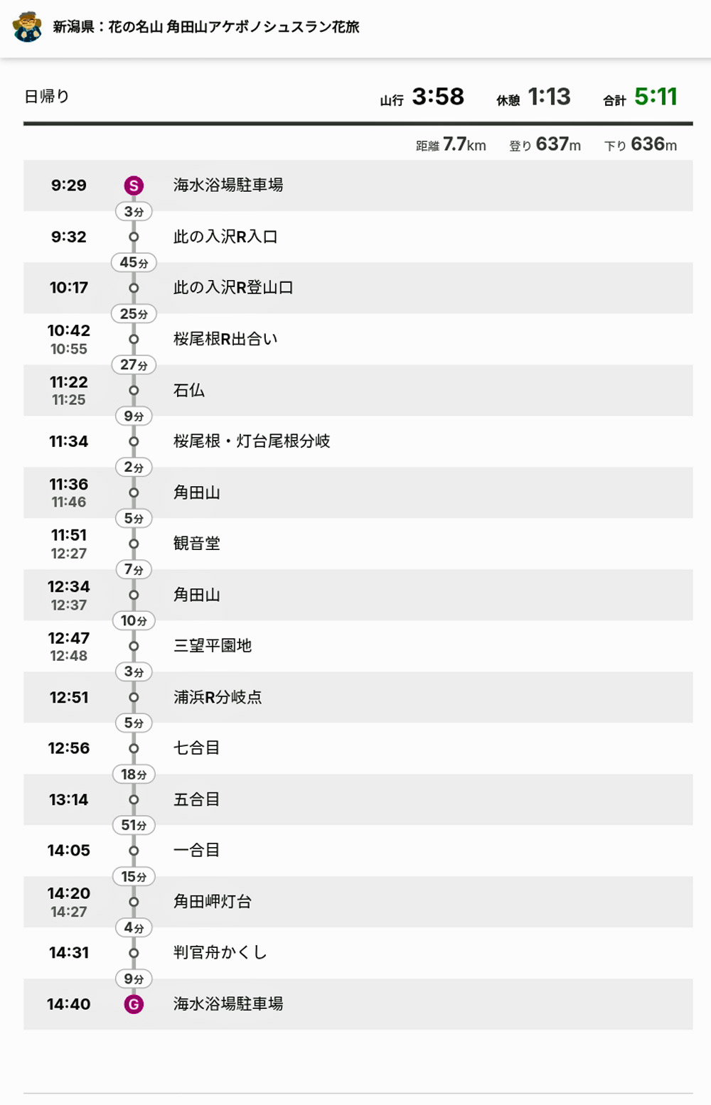 | 《角田山コースタイム》 写真撮影時間20分〜100分含む |