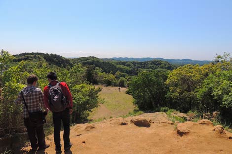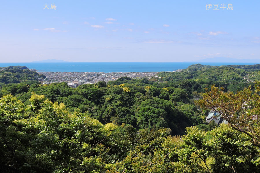 勝上献展望台より鎌倉市街と相模湾・由比ヶ浜、その奧左が大島、右に伊豆半島を望む |