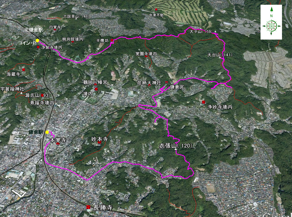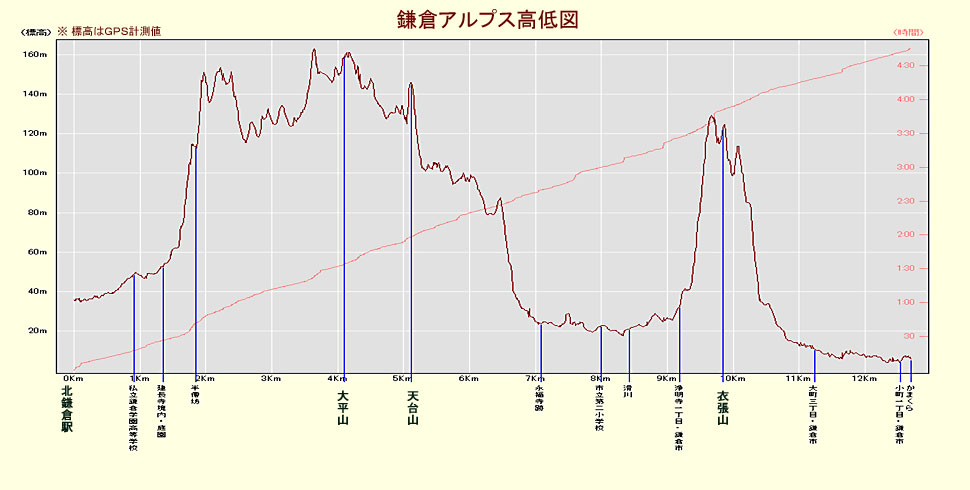 コインP標高/36M JR鎌倉駅標高/7M 標高差/152M 総歩行距離/12695M |